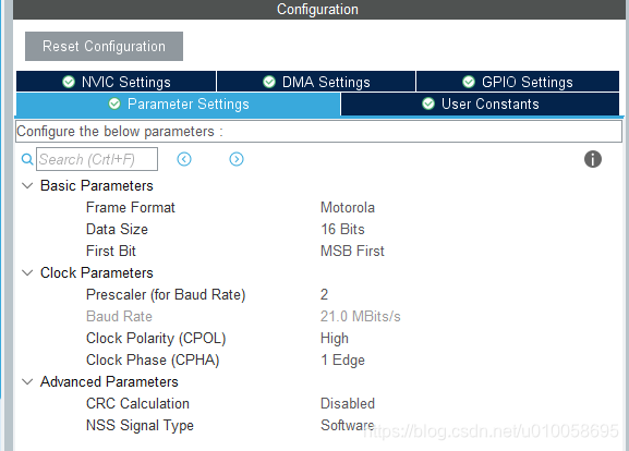 选择全双工模式,虽然只是用读功能,但是不影响。关闭硬件NSS片选信号,配置SPI数据位16bit,MSBFirst,波特率一般可以大于10MHz,SPI的模式根据AD7606手册应该选择为CPOL=High,CPHA=1Edge。数据量不大,一般不需要使用DMA,不需要用中断。
