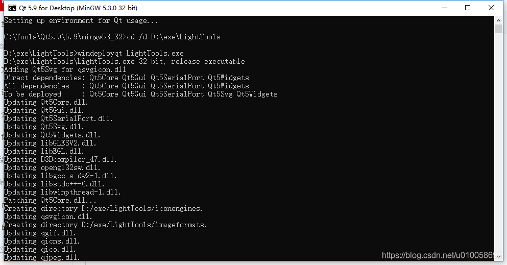 4:进入exe的文件夹 cd /d D:\exe:\LightTools 运行windeployqt hello.exe 等待抽取DLL完成。