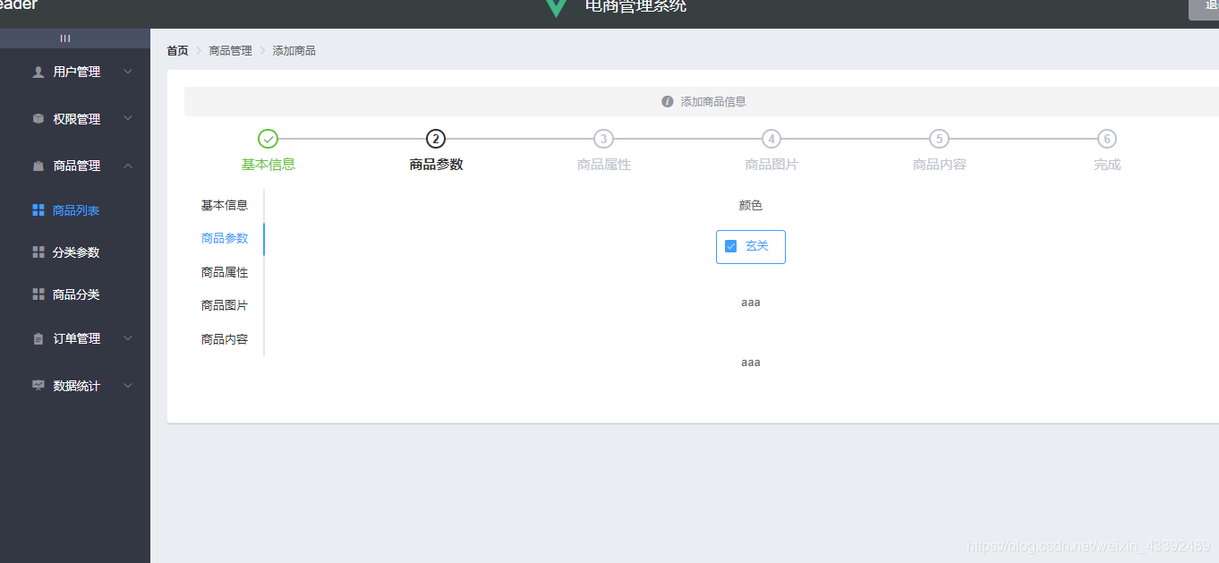 <template><div><!-- 面包屑导航区 --><el-breadcrumb separator-class="el-icon-arrow-right"><el-breadcrumb-item :to="{ path: '/home' }">首页</el-breadcrumb-item><el-breadcrumb-item>商品管理</el-breadcrumb-item><el-breadcrumb-item>添加商品</el-breadcrumb-item></el-breadcrumb><el-card><!-- 提示 --><el-alert title="添加商品信息" type="info" center show-icon :closable="false"></el-alert><!-- 步骤条 --><el-steps :space="200" :active="activeIndex-0" finish-status="success" align-center><el-step title="基本信息"></el-step><el-step title="商品参数"></el-step><el-step title="商品属性"></el-step><el-step title="商品图片"></el-step><el-step title="商品内容"></el-step><el-step title="完成"></el-step></el-steps><el-form:model="addForm":rules="addFormRules"ref="addFormRef"label-width="100px"label-position="top"><el-tabsv-model="activeIndex":tab-position="'left'":before-leave="beforeTabLeave"@tab-click="tabClicked"><el-tab-pane label="基本信息" name="0"><el-form-item label="商品名称" prop="goods_name"><el-input v-model="addForm.goods_name"></el-input></el-form-item><el-form-item label="商品价格" prop="goods_price"><el-input v-model="addForm.goods_price" type="number"></el-input></el-form-item><el-form-item label="商品重量" prop="goods_weight"><el-input v-model="addForm.goods_weight" type="number"></el-input></el-form-item><el-form-item label="商品数量" prop="goods_number"><el-input v-model="addForm.goods_number" type="number"></el-input></el-form-item><el-form-item label="商品分类" prop="goods_cat"><el-cascaderexpand-trigger="hover"v-model="addForm.goods_cat":options="cateList":props="cateProps"@change="handleChange"></el-cascader></el-form-item></el-tab-pane><el-tab-pane label="商品参数" name="1"><!-- 渲染表单的Item项 --><el-form-itemv-for="item in manyTableData":key="item.attr_id":label="item.attr_name"><!-- 复选框组 --><el-checkbox-group v-model="item.attr_vals"><el-checkbox :label="cb" v-for="(cb, i) in item.attr_vals" :key="i" border></el-checkbox></el-checkbox-group></el-form-item></el-tab-pane><el-tab-pane label="商品属性" name="2">商品属性</el-tab-pane><el-tab-pane label="商品图片" name="3">商品图片</el-tab-pane><el-tab-pane label="商品内容" name="4">商品内容</el-tab-pane></el-tabs></el-form></el-card></div>