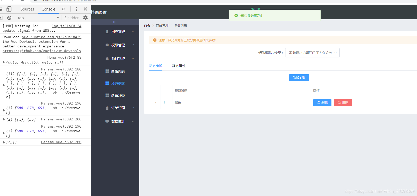 <template><div><!-- 面包屑导航区 --><el-breadcrumb separator-class="el-icon-arrow-right"><el-breadcrumb-item :to="{ path: '/home' }">首页</el-breadcrumb-item><el-breadcrumb-item>商品管理</el-breadcrumb-item><el-breadcrumb-item>参数列表</el-breadcrumb-item></el-breadcrumb><el-card><!-- 警告区域 --><el-alert title="注意:只允许为第三级分类设置相关参数!" type="warning" show-icon :closable="false"></el-alert><!-- 选择商品分类区域 --><el-row class="cat_opt"><el-col><span>选择商品分类:</span><!-- 商品分类的级联选择框 --><el-cascaderv-model="selectedCateKeys":options="cateList":props="cateProps"@change="handleChange"></el-cascader></el-col></el-row><el-tabs v-model="activeName" @tab-click="handleTabsClick"><el-tab-pane label="动态参数" name="many"><el-buttontype="primary"size="mini":disabled="isBtnDisabled "@click="addDialogVisible=true">添加参数</el-button><el-table :data="manyTableData" border stripe><el-table-column type="expand"></el-table-column><el-table-column type="index"></el-table-column><el-table-column label="参数名称" prop="attr_name"></el-table-column><el-table-column label="操作"><template slot-scope="scope"><el-buttontype="primary"icon="el-icon-edit"@click="showEditDialog(scope.row.attr_id)"size="mini">编辑</el-button><el-button type="danger" icon="el-icon-search" size="mini" @click="removeParams(scope.row.attr_id)">删除</el-button></template></el-table-column></el-table></el-tab-pane><el-tab-pane label="静态属性" name="only"><el-buttontype="primary"size="mini":disabled="isBtnDisabled"@click="addDialogVisible=true">添加属性</el-button><el-table :data="onlyTableData" border stripe><el-table-column type="expand"></el-table-column><el-table-column type="index"></el-table-column><el-table-column label="属性名称" prop="attr_name"></el-table-column><el-table-column label="操作"><template slot-scope="scope"><el-buttontype="primary"icon="el-icon-edit"size="mini"@click="showEditDialog(scope.row.attr_id)">编辑</el-button><el-button type="danger" icon="el-icon-search" size="mini" @click="removeParams(scope.row.attr_id)">删除</el-button></template></el-table-column></el-table></el-tab-pane></el-tabs></el-card><el-dialog:title=" '添加' + getTitleText":visible.sync="addDialogVisible"width="50%"@close="addDialogClosed"><el-form :model="addFrom" :rules="addFromRules" ref="addFromRef" label-width="100px"><el-form-item :label="getTitleText" prop="attr_name"><el-input v-model="addFrom.attr_name"></el-input></el-form-item></el-form><span slot="footer" class="dialog-footer"><el-button @click="addDialogVisible = false">取 消</el-button><el-button type="primary" @click="addParams">确 定</el-button></span></el-dialog><el-dialog:title=" '修改' + getTitleText":visible.sync="editDialogVisible"width="50%"@close="editDialogClosed"><el-form :model="editFrom" :rules="editFromRules" ref="editFromRef" label-width="100px"><el-form-item :label="getTitleText" prop="attr_name"><el-input v-model="editFrom.attr_name"></el-input></el-form-item></el-form><span slot="footer" class="dialog-footer"><el-button @click="editDialogClosed = false">取 消</el-button><el-button type="primary" @click="editParams">确 定</el-button></span></el-dialog></div>