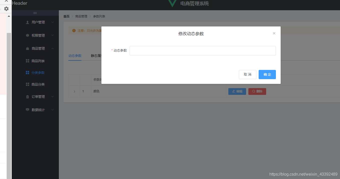 <template><div><!-- 面包屑导航区 --><el-breadcrumb separator-class="el-icon-arrow-right"><el-breadcrumb-item :to="{ path: '/home' }">首页</el-breadcrumb-item><el-breadcrumb-item>商品管理</el-breadcrumb-item><el-breadcrumb-item>参数列表</el-breadcrumb-item></el-breadcrumb><el-card><!-- 警告区域 --><el-alert title="注意:只允许为第三级分类设置相关参数!" type="warning" show-icon :closable="false"></el-alert><!-- 选择商品分类区域 --><el-row class="cat_opt"><el-col><span>选择商品分类:</span><!-- 商品分类的级联选择框 --><el-cascaderv-model="selectedCateKeys":options="cateList":props="cateProps"@change="handleChange"></el-cascader></el-col></el-row><el-tabs v-model="activeName" @tab-click="handleTabsClick"><el-tab-pane label="动态参数" name="many"><el-button type="primary" size="mini" :disabled="isBtnDisabled " @click="addDialogVisible=true">添加参数</el-button><el-table :data="manyTableData" border stripe><el-table-column type="expand"></el-table-column><el-table-column type="index"></el-table-column><el-table-column label="参数名称" prop="attr_name"></el-table-column><el-table-column label="操作"><template slot-scope="scope"><el-button type="primary" icon="el-icon-edit" @click="showEditDialog" size="mini">编辑</el-button><el-button type="danger" icon="el-icon-search" size="mini">删除</el-button></template></el-table-column></el-table></el-tab-pane><el-tab-pane label="静态属性" name="only"><el-button type="primary" size="mini" :disabled="isBtnDisabled" @click="addDialogVisible=true">添加属性</el-button><el-table :data="onlyTableData" border stripe><el-table-column type="expand"></el-table-column><el-table-column type="index"></el-table-column><el-table-column label="属性名称" prop="attr_name"></el-table-column><el-table-column label="操作"><template slot-scope="scope"><el-button type="primary" icon="el-icon-edit" size="mini" @click="showEditDialog">编辑</el-button><el-button type="danger" icon="el-icon-search" size="mini">删除</el-button></template></el-table-column></el-table></el-tab-pane></el-tabs></el-card><el-dialog:title=" '添加' + getTitleText":visible.sync="addDialogVisible"width="50%"@close="addDialogClosed"><el-form :model="addFrom" :rules="addFromRules" ref="addFromRef" label-width="100px"><el-form-item :label="getTitleText" prop="attr_name"><el-input v-model="addFrom.attr_name"></el-input></el-form-item></el-form><span slot="footer" class="dialog-footer"><el-button @click="addDialogVisible = false">取 消</el-button><el-button type="primary" @click="addParams">确 定</el-button></span></el-dialog><el-dialog:title=" '修改' + getTitleText":visible.sync="editDialogVisible"width="50%"@close="editDialogClosed"><el-form :model="editFrom" :rules="editFromRules" ref="addFromRef" label-width="100px"><el-form-item :label="getTitleText" prop="attr_name"><el-input v-model="editFrom.attr_name"></el-input></el-form-item></el-form><span slot="footer" class="dialog-footer"><el-button @click="editDialogClosed = false">取 消</el-button><el-button type="primary" @click="editParams">确 定</el-button></span></el-dialog></div>