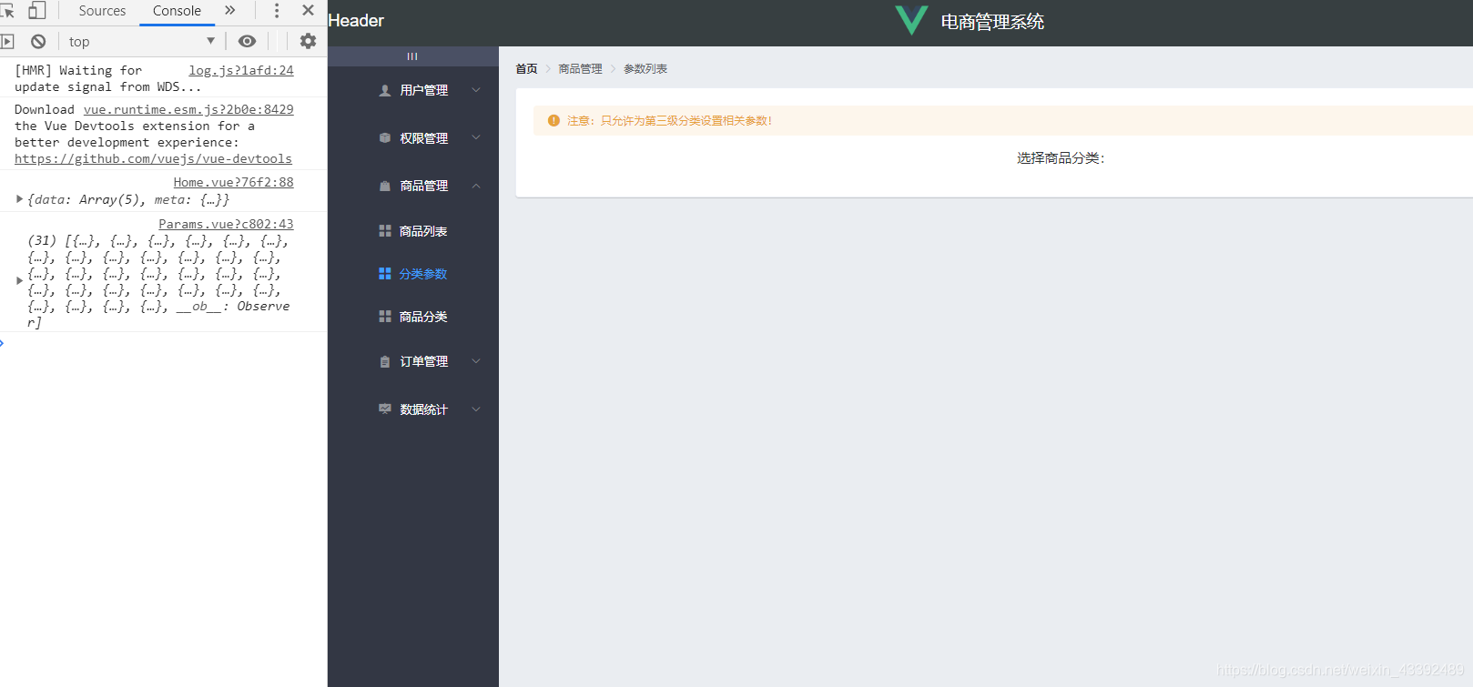 <template><div><!-- 面包屑导航区 --><el-breadcrumb separator-class="el-icon-arrow-right"><el-breadcrumb-item :to="{ path: '/home' }">首页</el-breadcrumb-item><el-breadcrumb-item>商品管理</el-breadcrumb-item><el-breadcrumb-item>参数列表</el-breadcrumb-item></el-breadcrumb><el-card><!-- 警告区域 --><el-alert title="注意:只允许为第三级分类设置相关参数!" type="warning" show-icon :closable="false"></el-alert><!-- 选择商品分类区域 --><el-row class="cat_opt"><el-col><span>选择商品分类:</span><!-- 商品分类的级联选择框 --></el-col></el-row></el-card></div></template><script>