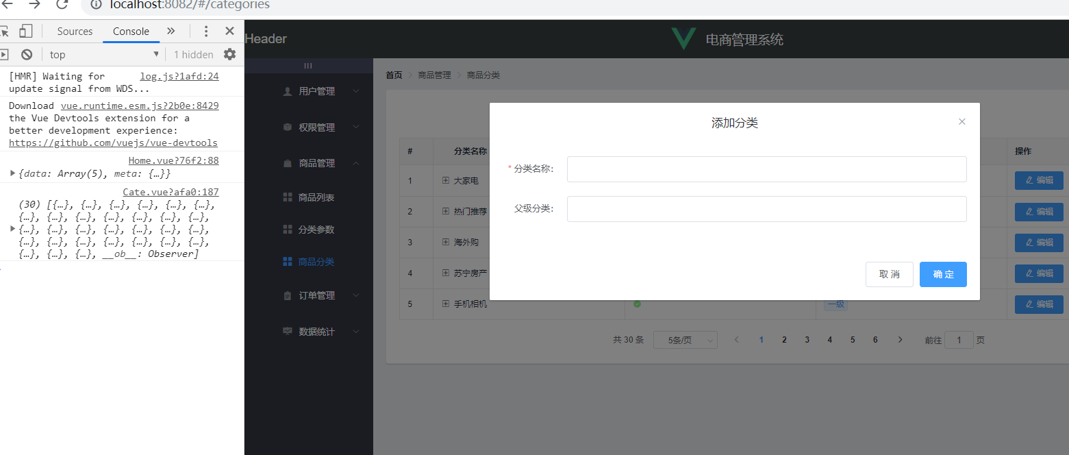 export default {data(){return{queryInfo:{type:3,pagenum:1,pagesize:5},parentCateList:[],cateList:[],total:0,addCateDialogVisible:false,columns:[{label:'分类名称',prop:'cat_name'},{label:'是否有效',type:'template',template:'isOk'},{label:'排序',type:'template',template:'order'},{label:'操作',type:'template',template:'opt'}],addCateForm:{cat_name:'',cat_pid:0,cat_level:0},// 添加分类表单的验证规则addCateFormRules: {cat_name: [{ required: true, message: '请输入分类名称', trigger: 'blur' }]}}},created(){this.getCateList()},methods:{async getCateList(){const { data: res } = await this.$http.get('categories', {params: this.queryInfo})if (res.meta.status !== 200) {return this.$message.error('获取商品分类失败!')}// 给数据列表赋值this.cateList = res.data.result// 总数据条数this.total = res.data.total},// 监听 pageSizeChangehandleSizeChange (newSize) {this.queryInfo.pagesize = newSizethis.getCateList()},// 监听 pagenum改变handleCurrentChange (newPage) {this.queryInfo.pagenum = newPagethis.getCateList()},showAddCateDialog(){this.getParentCateList()this.addCateDialogVisible=true},// 获取父级分类的数据async getParentCateList () {const { data: res } = await this.$http.get('categories', {params: { type: 2 }})if (res.meta.status !== 200) {return this.$message.error('获取父级分类失败!')}this.parentCateList = res.dataconsole.log(this.parentCateList)}}