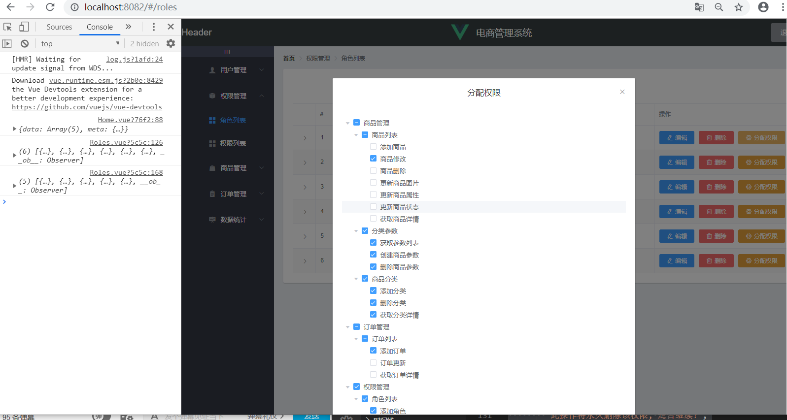 <template><div><!-- 面包屑导航区 --><el-breadcrumb separator-class="el-icon-arrow-right"><el-breadcrumb-item :to="{ path: '/home' }">首页</el-breadcrumb-item><el-breadcrumb-item>权限管理</el-breadcrumb-item><el-breadcrumb-item>角色列表</el-breadcrumb-item></el-breadcrumb><el-card><el-row><el-col><el-button type="primary">添加角色</el-button></el-col></el-row><el-table :data="roleslist" border stripe><el-table-column type="expand"><template slot-scope="scope"><el-row:class="['bdbottom', i1 === 0 ? 'bdtop' : '', 'vcenter']" v-for="(item1, i1) in scope.row.children":key="item1.id"><!-- 一级权限 --><el-col :span="5"><el-tag closable @close="removeRightById(scope.row, item1.id)">{{ item1.authName}}</el-tag><i class="el-icon-caret-right"></i></el-col><el-col :span="19"><el-row :class="[i2 === 0 ? '' : 'bdtop','vcenter']"v-for="(item2, i2) in item1.children":key="item2.id"><el-col :span="6 "><el-tagtype="success"closable@close="removeRightById(scope.row, item2.id)">{{ item2.authName }}</el-tag><i class="el-icon-caret-right"></i></el-col><el-col :span="18"><el-tagtype="warning"v-for="(item3) in item2.children":key="item3.id"closable@close="removeRightById(scope.row,item3.id)">{{ item3.authName}}</el-tag></el-col></el-row></el-col></el-row><!--<pre>{{scope.row}}</pre>--></template></el-table-column><!-- 索引列 --><el-table-column type="index" label="#"></el-table-column><el-table-column label="角色名称" prop="roleName"></el-table-column><el-table-column label="角色描述" prop="roleDesc"></el-table-column><el-table-column label="操作" width="300px"><template slot-scope="scope"><el-button type="primary" icon="el-icon-edit" size="mini" >编辑</el-button><el-button type="danger" icon="el-icon-delete" size="mini" >删除</el-button><el-buttontype="warning"icon="el-icon-setting"size="mini"@click="showSetRightDialog(scope.row)">分配权限</el-button></template></el-table-column></el-table></el-card><!-- 分配权限 --><el-dialogtitle="分配权限":visible.sync="setRightDialogVisible"width="50%"><el-tree:data="rightslist":props="treeProps"ref="treeRef"show-checkboxnode-key="id"default-expand-all:default-checked-keys="defKeys"></el-tree><span slot="footer" class="dialog-footer"><el-button @click="setRightDialogVisible = false">取 消</el-button><el-button type="primary" @click="setRightDialogVisible = false">确 定</el-button></span></el-dialog></div>