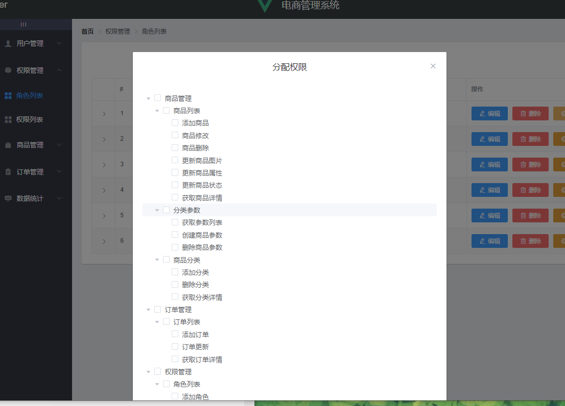 <template><div><!-- 面包屑导航区 --><el-breadcrumb separator-class="el-icon-arrow-right"><el-breadcrumb-item :to="{ path: '/home' }">首页</el-breadcrumb-item><el-breadcrumb-item>权限管理</el-breadcrumb-item><el-breadcrumb-item>角色列表</el-breadcrumb-item></el-breadcrumb><el-card><el-row><el-col><el-button type="primary">添加角色</el-button></el-col></el-row><el-table :data="roleslist" border stripe><el-table-column type="expand"><template slot-scope="scope"><el-row:class="['bdbottom', i1 === 0 ? 'bdtop' : '', 'vcenter']" v-for="(item1, i1) in scope.row.children":key="item1.id"><!-- 一级权限 --><el-col :span="5"><el-tag closable @close="removeRightById(scope.row, item1.id)">{{ item1.authName}}</el-tag><i class="el-icon-caret-right"></i></el-col><el-col :span="19"><el-row :class="[i2 === 0 ? '' : 'bdtop','vcenter']"v-for="(item2, i2) in item1.children":key="item2.id"><el-col :span="6 "><el-tagtype="success"closable@close="removeRightById(scope.row, item2.id)">{{ item2.authName }}</el-tag><i class="el-icon-caret-right"></i></el-col><el-col :span="18"><el-tagtype="warning"v-for="(item3) in item2.children":key="item3.id"closable@close="removeRightById(scope.row,item3.id)">{{ item3.authName}}</el-tag></el-col></el-row></el-col></el-row><!--<pre>{{scope.row}}</pre>--></template></el-table-column><!-- 索引列 --><el-table-column type="index" label="#"></el-table-column><el-table-column label="角色名称" prop="roleName"></el-table-column><el-table-column label="角色描述" prop="roleDesc"></el-table-column><el-table-column label="操作" width="300px"><template slot-scope="scope"><el-button type="primary" icon="el-icon-edit" size="mini" >编辑</el-button><el-button type="danger" icon="el-icon-delete" size="mini" >删除</el-button><el-buttontype="warning"icon="el-icon-setting"size="mini"@click="showSetRightDialog()">分配权限</el-button></template></el-table-column></el-table></el-card><!-- 分配权限 --><el-dialogtitle="分配权限":visible.sync="setRightDialogVisible"width="50%"><span slot="footer" class="dialog-footer"><el-button @click="setRightDialogVisible = false">取 消</el-button><el-button type="primary" @click="setRightDialogVisible = false">确 定</el-button></span></el-dialog></div>