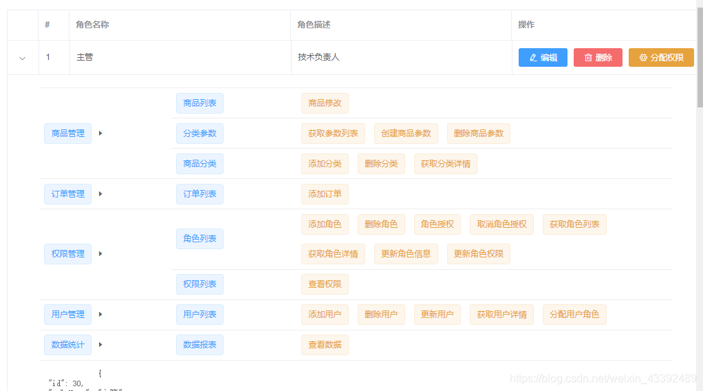 <template><div><!-- 面包屑导航区 --><el-breadcrumb separator-class="el-icon-arrow-right"><el-breadcrumb-item :to="{ path: '/home' }">首页</el-breadcrumb-item><el-breadcrumb-item>权限管理</el-breadcrumb-item><el-breadcrumb-item>角色列表</el-breadcrumb-item></el-breadcrumb><el-card><el-row><el-col><el-button type="primary">添加角色</el-button></el-col></el-row><el-table :data="roleslist" border stripe><el-table-column type="expand"><template slot-scope="scope"><el-row:class="['bdbottom', i1 === 0 ? 'bdtop' : '', 'vcenter']" v-for="(item1, i1) in scope.row.children":key="item1.id"><!-- 一级权限 --><el-col :span="5"><el-tag > {{item1.authName}}</el-tag><i class="el-icon-caret-right"></i></el-col><el-col :span="19"><el-row :class="[i2 === 0 ? '' : 'bdtop','vcenter']"v-for="(item2, i2) in item1.children":key="item2.id"><el-col :span="6"><el-tag>{{ item2.authName }}</el-tag></el-col><el-col :span="18"><el-tagtype="warning"v-for="(item3) in item2.children":key="item3.id">{{ item3.authName}}</el-tag></el-col></el-row></el-col></el-row><pre>{{scope.row}}</pre></template></el-table-column><!-- 索引列 --><el-table-column type="index" label="#"></el-table-column><el-table-column label="角色名称" prop="roleName"></el-table-column><el-table-column label="角色描述" prop="roleDesc"></el-table-column><el-table-column label="操作" width="300px"><template slot-scope="scope"><el-button type="primary" icon="el-icon-edit" size="mini" >编辑</el-button><el-button type="danger" icon="el-icon-delete" size="mini" >删除</el-button><el-buttontype="warning"icon="el-icon-setting"size="mini">分配权限</el-button></template></el-table-column></el-table></el-card></div>