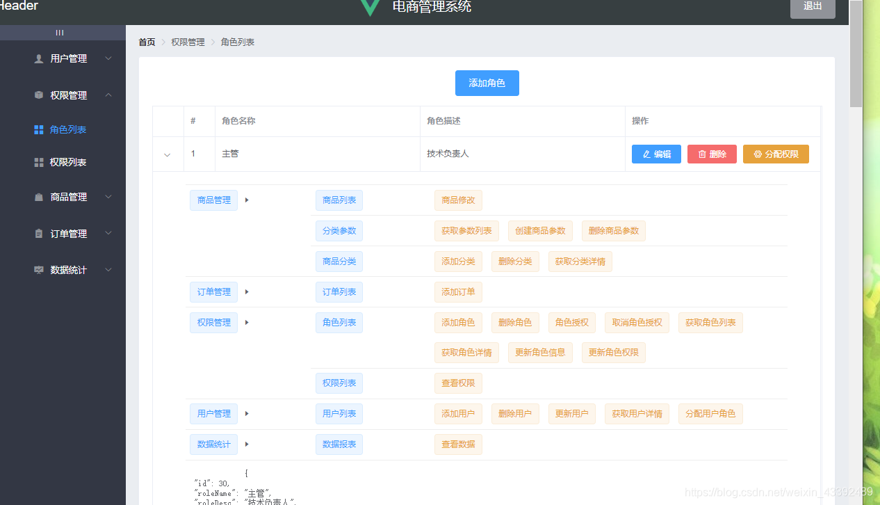 <template><div><!-- 面包屑导航区 --><el-breadcrumb separator-class="el-icon-arrow-right"><el-breadcrumb-item :to="{ path: '/home' }">首页</el-breadcrumb-item><el-breadcrumb-item>权限管理</el-breadcrumb-item><el-breadcrumb-item>角色列表</el-breadcrumb-item></el-breadcrumb><el-card><el-row><el-col><el-button type="primary">添加角色</el-button></el-col></el-row><el-table :data="roleslist" border stripe><el-table-column type="expand"><template slot-scope="scope"><el-row:class="['bdbottom', i1 === 0 ? 'bdtop' : '', 'vcenter']" v-for="(item1, i1) in scope.row.children":key="item1.id"><!-- 一级权限 --><el-col :span="5"><el-tag > {{item1.authName}}</el-tag><i class="el-icon-caret-right"></i></el-col><el-col :span="19"><el-row :class="[i2 === 0 ? '' : 'bdtop']"v-for="(item2, i2) in item1.children":key="item2.id"><el-col :span="6"><el-tag>{{ item2.authName }}</el-tag></el-col><el-col :span="18"><el-tagtype="warning"v-for="(item3) in item2.children":key="item3.id">{{ item3.authName}}</el-tag></el-col></el-row></el-col></el-row><pre>{{scope.row}}</pre></template></el-table-column><!-- 索引列 --><el-table-column type="index" label="#"></el-table-column><el-table-column label="角色名称" prop="roleName"></el-table-column><el-table-column label="角色描述" prop="roleDesc"></el-table-column><el-table-column label="操作" width="300px"><template slot-scope="scope"><el-button type="primary" icon="el-icon-edit" size="mini" >编辑</el-button><el-button type="danger" icon="el-icon-delete" size="mini" >删除</el-button><el-buttontype="warning"icon="el-icon-setting"size="mini">分配权限</el-button></template></el-table-column></el-table></el-card></div>