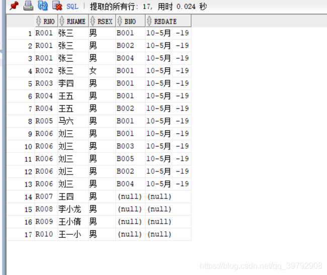 select reader.rno,rname,rb.bno from rb left outer join reader on (reader.rno=rb.rno);