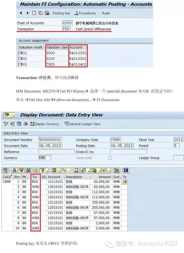 存货变动所生成的会计凭证有一个规律,这个规律就是一定有相应存货的增加或减少。比如PO收货会导致存货增加,而发料则导致存货减少。而对应的科目则各不相同,比如PO收货对应的科目是应付账款(在SAP中是GR/IR),发料对应的科目应该是生产成本类科目。根据这一规律,SAP系统也将存货过账分为存货科目(Stock Account)和消耗科目(Consumption Account)。存货的增加与减少用存货科目, Transaction key BSX码就是用于存货科目的配置; 对方科目因为各不相同,也就有不同的Transaction key。比如GBB用来配置冲销科目,PRD用来配置价格差异科目等等。有时,一种transaction key还须细分不同的情况,这时就要用到Account Modification了。比如在GBB(冲销科目)中,在冲销科目中,再用BSA(一种account modification)表示初始化科目,用VBR表示物料消耗科目。Transaction key和account modification组合在一起,称为价值串(value string),与movement type对应。用户在MM模块过账时,会选择movement type,系统则根据movement type确定价值串,价值串确定transaction key和account modification,据此找到对应的会计科目,自动过账也就实现了。这一段话是理解自动过账的关键。