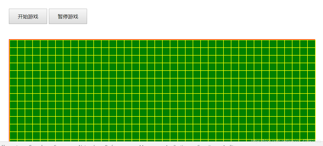 </head><body><div id="main"><!-- 按钮 --><input class="btn" type="button" value="开始游戏" id="begin"><input class="btn" type="button" value="暂停游戏" id="pause"></div><!-- 贪吃蛇游戏设计 --><script>var main = document.getElementById('main');/* 画布格子是否开启 */var showcanvas = true;/* atom 原子大小 xnum横向原子数量 ynum纵向原子数量 */function Map(atom, xnum, ynum) {this.atom = atom;this.xnum = xnum;this.ynum = ynum;//声明画布this.canvas = null;//创建画布方法this.create = function() {this.canvas = document.createElement('div');this.canvas.style.cssText = 'position:relative;top:40px;border:1px solid red;background:#FAFAFA';this.canvas.style.width = this.atom * this.xnum + 'px'; //画布的宽this.canvas.style.height = this.atom * this.ynum + 'px'; //画布的宽main.appendChild(this.canvas);if (showcanvas) {for (var x = 0; x < xnum; x++) {for (var y = 0; y < ynum; y++) {var a = document.createElement('div');a.style.cssText = "border:1px solid yellow";a.style.width = this.atom + 'px';a.style.height = this.atom + 'px';a.style.backgroundColor = 'green';this.canvas.appendChild(a);a.style.position = 'absolute';a.style.left = x * this.atom + 'px';a.style.top = y * this.atom + 'px';}}}}}var map = new Map(20, 40, 20);map.create();var timer; //变量可以提升/* 第一部分 *//* 第一部分开始 */document.getElementById('begin').onclick = function() {clearInterval(timer);timer = setInterval(function() {}, 300)}/*第一部分 暂停 */document.getElementById('begin').onclick = function() {clearInterval(timer);timer = setInterval(function() {}, 300)}</script>