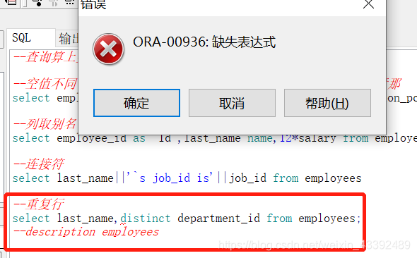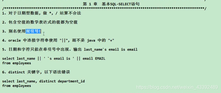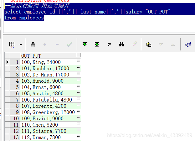 - 显示出表employees的全部列,各个列之间用逗号连接,列头显示成OUT_PUT