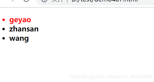 <!-- ng-bind遇到html的时候会转义 为了安全 --><body ng-app="myApp1"><ul ng-controller="ListController"><!-- class="{{$even?'red':'green'}}" --><!-- ng-class会根据当前的值决定是否谈价特定类名 --><li ng-repeat="name in student track by $index" ng-class="{red:name.startsWith('g')}"><strong>{{name}}</strong></li></ul><script src="./js/Angular.js"></script><!-- 隔行换色 --><script>var myApp1 = angular.module('myApp1', []);myApp1.controller('ListController', ['$scope', function($scope) {$scope.student = ['geyao', 'zhansan', 'wang']}])</script>