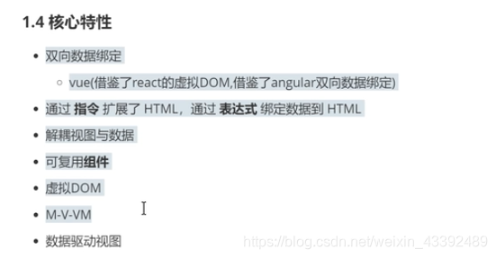 #### 1.4 核心特性- 双向数据绑定- vue(借鉴了react的虚拟DOM,借鉴了angular双向数据绑定)