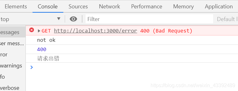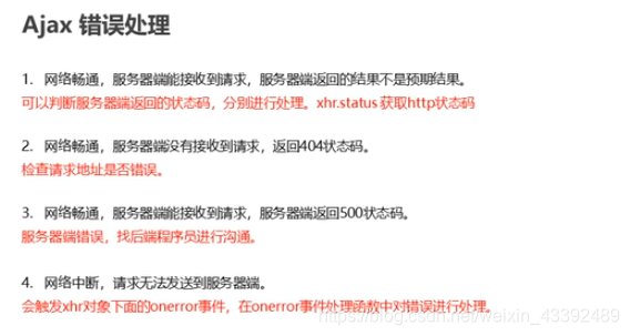</head><body><button id="btn">发送ajax请求</button><script>var xhr = new XMLHttpRequest();xhr.open('get', 'http://localhost:3000/error');xhr.onreadystatechange = function() {//if (xhr.readyState == 4) {//属性获取状态码console.log(xhr.responseText);console.log(xhr.status);if (xhr.status == 400) {console.log('请求出错');} else if (xhr.readyState == 404) {console.log('地址错误');}}xhr.onerror = function() {console.log('网络中断,无法发送ajax请求')}}xhr.send();</script>