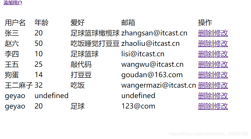 app.on('request', async(req, res) => {//请求方式const method = req.method;//请求地址const { pathname } = url.parse(req.url);if (method == 'GET') {//呈现用户列表页面if (pathname == '/list') {let users = await User.find();console.log(users);let list = `<!DOCTYPE html><html lang="en"><head><meta charset="UTF-8"><meta name="viewport" content="width=device-width, initial-scale=1.0"><title>Document</title></head><body><div class="container"><h6><a href="/add" class="btn btn-primary">添加用户</a></h6><table class="table table-striped table-bordered"><tr><td>用户名</td><td>年龄</td><td>爱好</td><td>邮箱</td><td>操作</td></tr>`;//循环users.forEach(item => {list += `<tr><td>${item.name}</td><td>${item.age}</td><td>`item.hobbies.forEach(item => {list += `<span>${item}</span>`})list += ` </td> <td>${item.email}</td><td><a href="">删除</a>|<a href="">修改</a></td></tr>`;})list += ` </table></div></body></html>`res.end(list);} else if (pathname == '/add') {let add = `<!DOCTYPE html><html lang="en"><head><meta charset="UTF-8"><meta name="viewport" content="width=device-width, initial-scale=1.0"><title>Document</title></head><body><div class="container"><h3>添加用户</h3><form method="post" action="/add"><div class="form-group"><label>用户名</label><input name="name" type="text" class="form-control" placeholder="请输入用户名"></div><div class="form-group"><label>密码</label><input name="password" type="password" class="form-control" placeholder="请输入密码"></div><div class="form-group"><label>年龄</label><input name="age" type="text" class="form-control" placeholder="请输入年龄"></div><div class="form-group"><label>邮箱</label><input name="email" type="text" class="form-control" placeholder="请输入年龄"></div><div><label class="checkbox-inline"><input type="checkbox" value="足球" name="hobbies">足球</label><label class="checkbox-inline"><input type="checkbox" value="篮球" name="hobbies">篮球</label><label class="checkbox-inline"><input type="checkbox" value="游戏" name="hobbies">游戏</label><label class="checkbox-inline"><input type="checkbox" value="娱乐" name="hobbies">娱乐</label><label class="checkbox-inline"><input type="checkbox" value="爬山" name="hobbies">爬山</label><label class="checkbox-inline"><input type="checkbox" value="划船" name="hobbies">划船</label><button type="submit">添加用户</button></div></form></div></body></html>`res.end(add);}} else if (method == 'POST') {//接受用户提交信息if (pathname == '/add') {let formData = '';req.on('data', param => {formData += param;})req.on('end', async() => {let user = querystring.parse(formData);await User.create(user);res.writeHead(301, {Location: 'list'});res.end();})}}url.parse(req.url);/* res.end('ok'); */