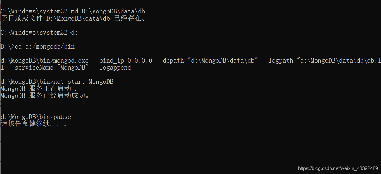 然后重新执行mongod.exe --bind_ip 0.0.0.0 --dbpath "d:\MongoDB\data\db" --logpath "d:\MongoDB\data\db\db.log" --install --serviceName "MonGoDB" --logappend 命令创建服务