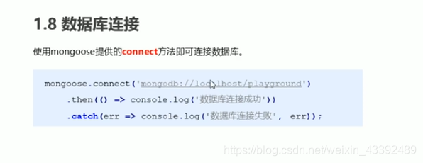 mongoose.connect('mongodb://localhost/playground', { useUnifiedTopology: true }).then(() => console.log('数据库连接成功')).catch(err => console.log(err, '数据库连接失败'))
