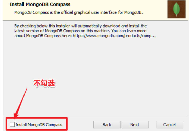 在安装的时候不勾选 Install MongoDB Compass选项即可