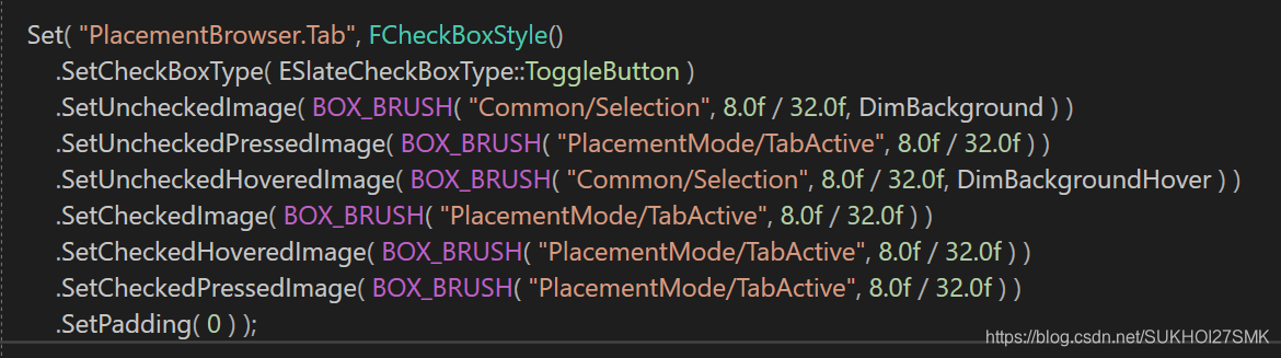 4. 通过查找 “PlacementBrowser.Tab”名称,可以找到这个style的设置是在SlateEditorStyle.cpp中,如下图