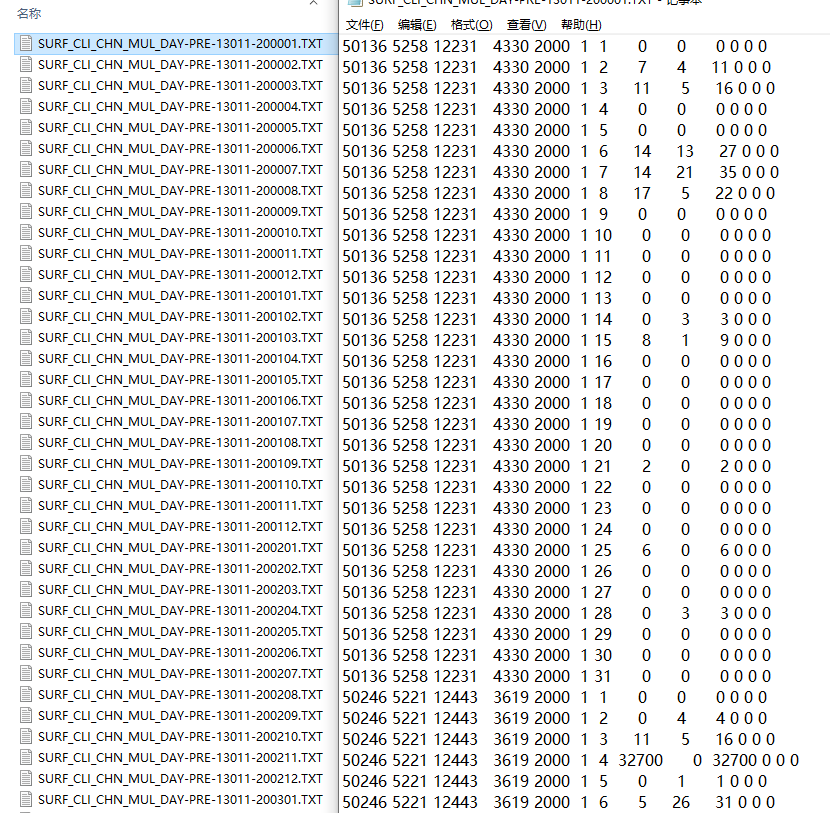 txt文件中显示的全国站点每天的信息,主要处理思想为将日数据先处理成月数据(注意保留年份),再将月数据都放到一起,处理成年数据。