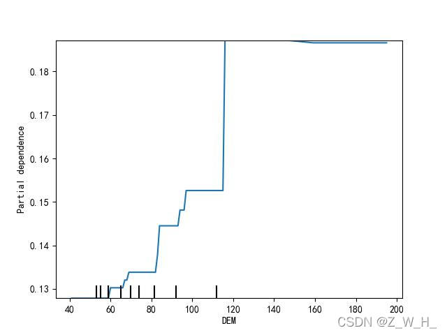 #部分依赖图features = execldataheadfor i in features:display = plot_partial_dependence(model, train_data, [i])#wspace 为子图之间的空间保留的宽度,平均轴宽的一部分#hspace为子图之间的空间保留的高度,平均轴高度的一部分#加了这个语句,子图会稍变小,因为空间也占用坐标轴的一部分display.figure_.subplots_adjust(wspace=0.4, hspace=0.3)plt.savefig(temp_path +"树的部分依赖图/"+i+'部分依赖图.jpg')plt.show()