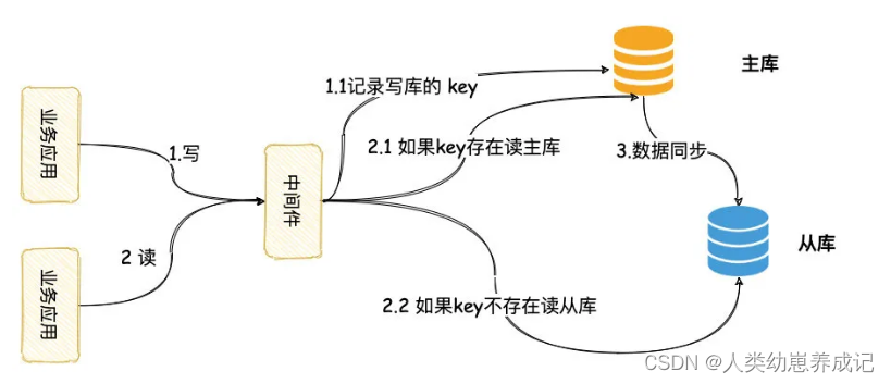 - 一定时间后(经验值),中间件认为主从同步完成,删除这个 key,后续读将会读从库