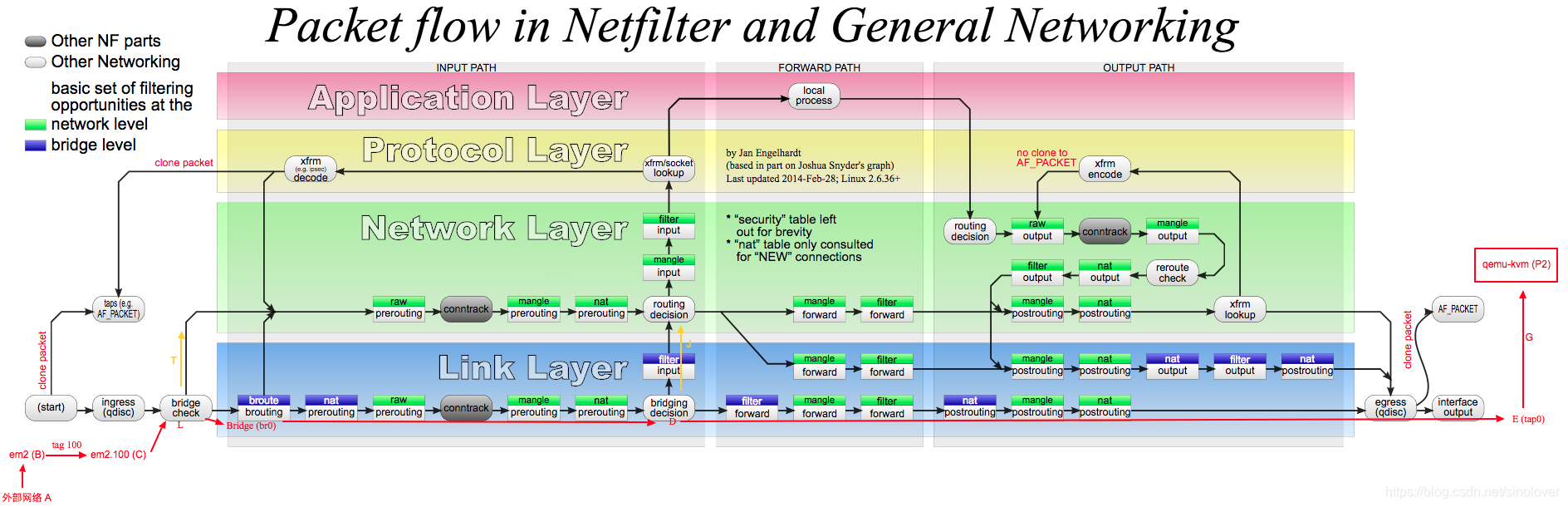 Bridge的出现使Linux上设置防火墙变得复杂,因为此时从物理网卡进入主机的数据包目的地可能是其上运行的一台虚拟机。上图是上面介绍的数据从外部网络(A)发往虚拟机(P2)这一过程中数据包所经过的防火墙链(文中的两张图可以对比来看)。物理网卡em2子设备em2.100从外部网络A收到二层数据包,经过bridge check后进入br0并穿越一系列防火墙链L --> D --> E,最终从Bridge上的另一个接口tap0发出。上图红色导向线可以很清楚看到整个过程中数据包是没有进入主机内核协议栈的,因此位于主机IP层(Network Layer)的iptables根本无法过滤L --> D --> E这一路径的数据包。那有没有办法使iptables能够过滤Bridge中的数据包呢?