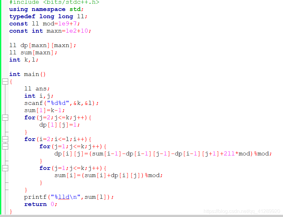 如果一个自然数N的K进制表示中任意的相邻的两位都不是相邻的数字,那么我们就说这个数是K好数。求L位K进制数中K好数的数目。例如K = 4,L = 2的时候,所有K好数为11、13、20、22、30、31、33 共7个。由于这个数目很大,请你输出它对1000000007取模后的值。