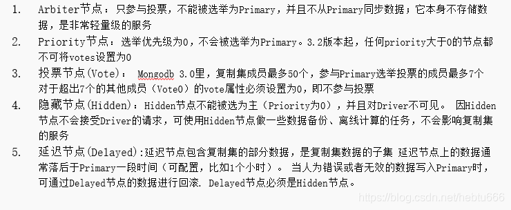 - 添加冲裁节点:①启动仲裁节点所需的mongdb实例②连接上主节点③添加仲裁节点到副本集中rs.addArb(“127.0.0.1:27020”)④查看复制集状态