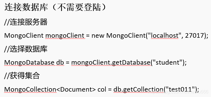 2)连接远程的mongdb服务器:mongo “mongodb://mongodb0.example.com:27017” 3)查看所以数据库:show dbs 4)创建数据库:use DATABASE_NAME use database1 5)创建集合:插入数据时候自动创建集合 6)插入文档:db.cllection1.insert({name:”张三”,age:20})