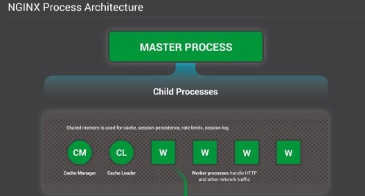 在四核服务器上,nginx主进程会创建四个工作进程,及若干缓存辅助进程,管理磁盘上的内容缓存。