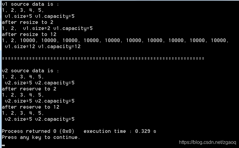 {vector<int> v1{1, 2, 3, 4, 5};std::cout << "v1 source data is : " << "\n";for (auto &v : v1){std::cout << v << ", ";}std::cout << "\n" << " v1.size=" << v1.size() << " v1.capacity=" << v1.capacity() << endl;std::cout << "after resize to 2" << endl;v1.resize(2); //尺寸由5改变为2,多余字符被截掉了,只剩下hefor (auto &v : v1){std::cout << v << ", ";}std::cout << " v1.size=" << v1.size() << " v1.capacity=" << v1.capacity() << endl;std::cout << "after resize to 12" << endl;v1.resize(12, 10000); //尺寸由2改变为12, 后面的数据被填充了10个0for (auto &v : v1){std::cout << v << ", ";}std::cout << "\n" << " v1.size=" << v1.size() << " v1.capacity=" << v1.capacity() << endl;std::cout << "\n";std::cout << "===================================================================" << endl;std::cout << "\n";vector<int> v2{1, 2, 3, 4, 5};std::cout << "v2 source data is : " << "\n";for (auto &v : v2){std::cout << v << ", ";}std::cout << "\n" << " v2.size=" << v2.size() << " v2.capacity=" << v2.capacity() << endl;std::cout << "after reserve to 2" << endl;v1.reserve(2); // size-内容不变,capacity()可能会变化for (auto &v : v2){std::cout << v << ", ";}std::cout << "\n" << " v2.size=" << v2.size() << " v2.capacity=" << v2.capacity() << endl;std::cout << "after reserve to 12" << endl;v1.reserve(12); //size-内容不变,capacity()可能会变化for (auto &v : v2){std::cout << v << ", ";}std::cout << "\n" << " v2.size=" << v2.size() << " v2.capacity=" << v2.capacity() << endl;return 0;