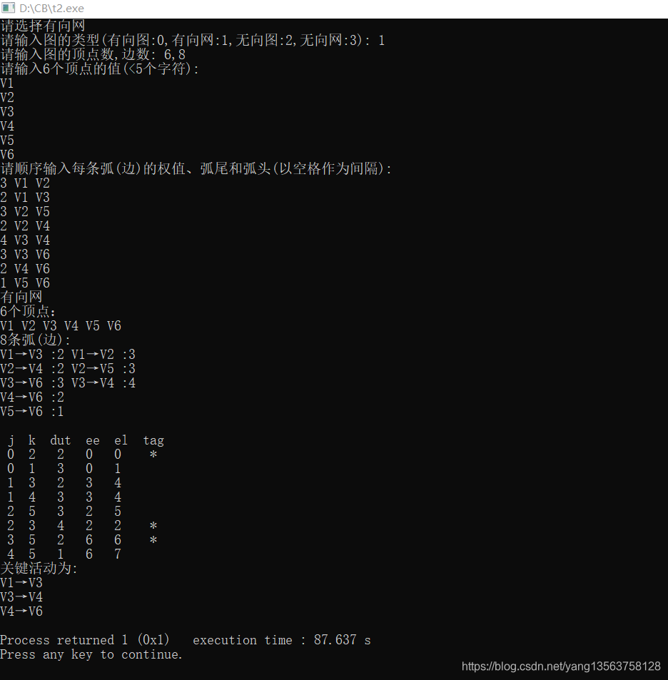 由于在AOE网中有些活动可以并行的进行,所以完成工程的最短时间是从开始点到完成点的最长路径的长度。路径最长的叫关键路径,我们用e(i)表示活动最早开始时间,l(i)表示最迟开始时间。两者之差l(i)一e(i)意味着完成活动a的时间余量。我们把l(i)=e(i)的活动叫做关键活动。显然;关键路径上的所有活动都是关键活动,因此提前完成非关键活动并不能加快工程的进度。