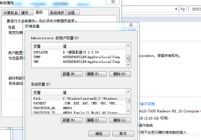 通过点击计算机-->属性-->高级-->环境变量