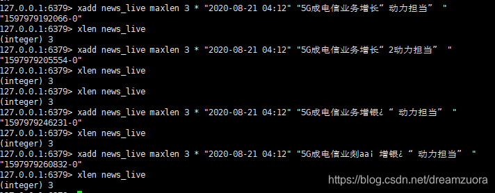 xadd news_live * "2020-08-21 10:20" "国航CA1704航班遇颠簸下降千米,业内人士解释:正常操作 "xadd news_live * "2020-08-21 04:12" "5G成电信业务增长“动力担当” "