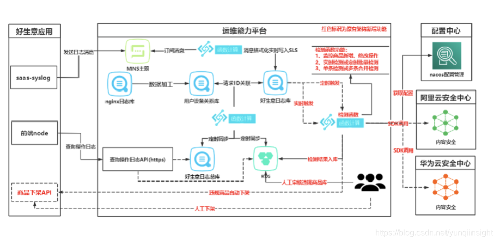 畅捷通借用系统的操作日志和消息队列,将内容安全检测和业务功能进行解耦,借助函数计算的能力,按需调用云服务厂商提供的安全检测能力(文字类、图片类等),去识别可分享的业务,内容是否符合安全法,检测结果还增加了人工审核及误判赦免。