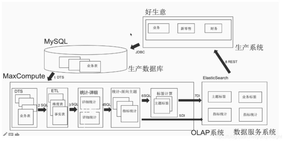 统计分析类数据,畅捷通每天通过 DTS 将原始数据从关系型数据库增量同步到数据仓库里,在固定时间进行数据清洗、汇总统计分析后,再将这部分数据传输 Elasticsearch 。同时畅捷通也利用 MaxCompute 的多任务计算能力,进行业务数据的标签计算,计算结果也传递给 Elasticsearch ,业务系统通过 Elasticsearch 的 REST API 访问这些数据,并展现给最终用户。