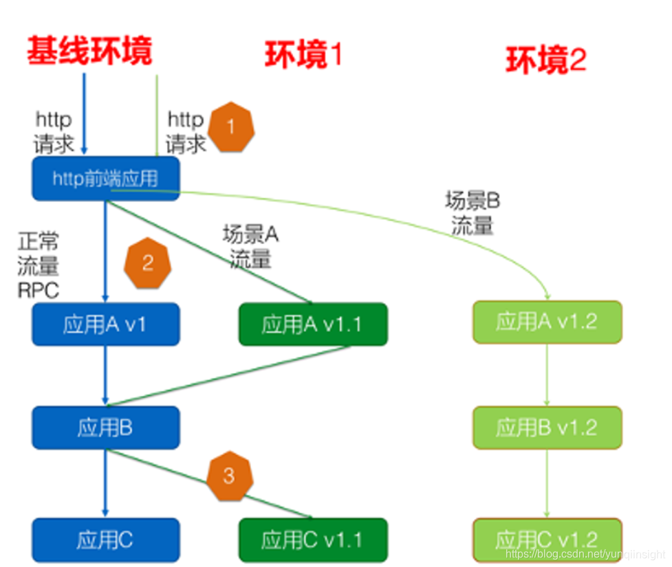 综合效率和成本方面的因素,畅捷通引入网关、全链路流量精确控制技术、端云联调技术,用基线环境+增量修改的应用叠加出项目开发环境:在入口处根据企业 Id 进行流量打标(根据企业 ID 在请求中注入环境标识),如:https://cloud.chanjet.com/req?orgId =企业 ID ,环境标识随请求在整个执行流程中流转(http 请求,rpc 请求,定时任务,消息等),通过环境标识,对微服务调用/消息进行精确控制。如图: