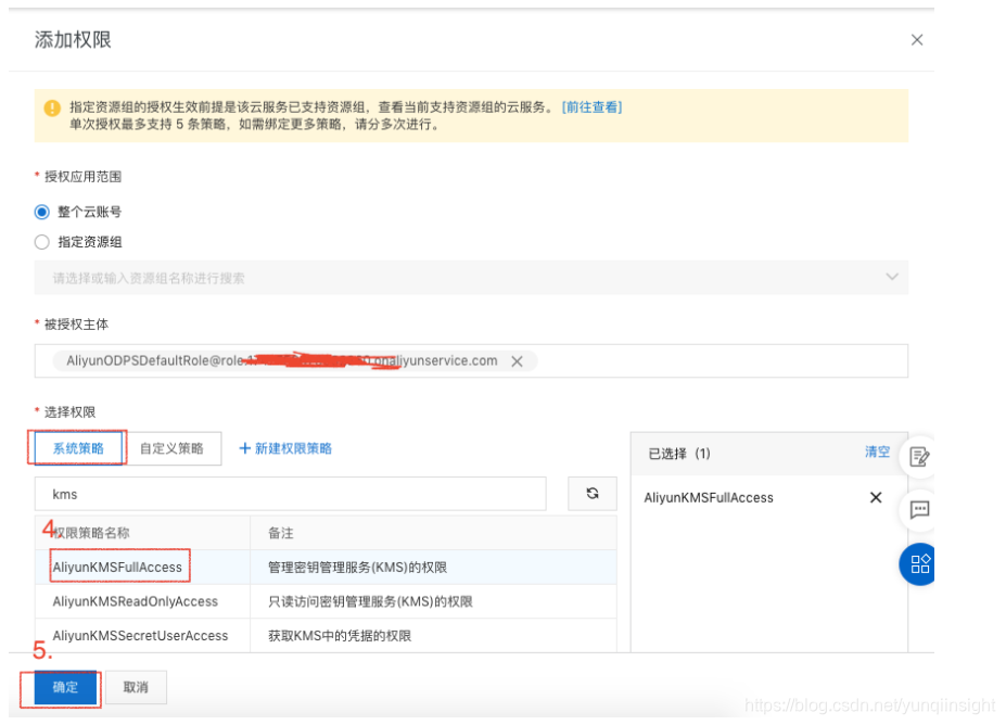 4.选择系统策略权限AliyunKMSFullAccess(管理密钥管理服务(KMS)的权限),管理KMS最大的权限可以选择使用