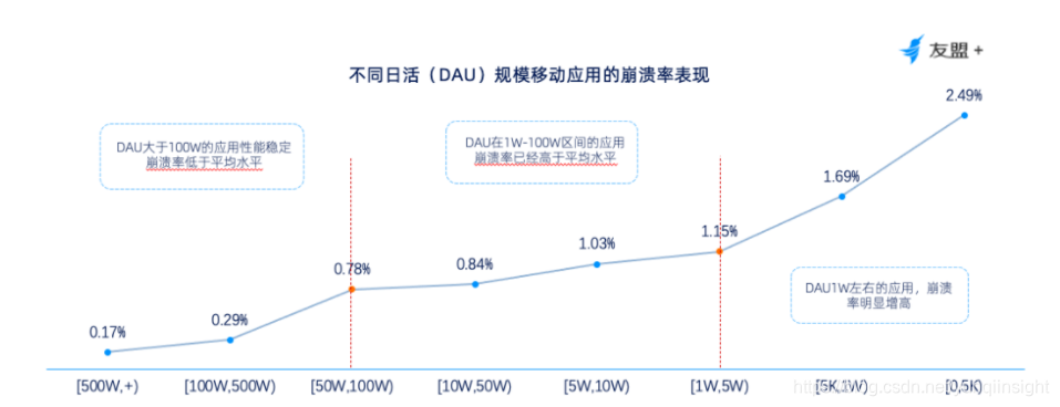 移动应用崩溃率随日活(DAU)规模增大而逐步下降。日活(DAU)规模大于100万的移动应用,崩溃率明显低于平均水平;崩溃率曲线在日活(DAU)小于1万时出现拐点,崩溃率明显增高。