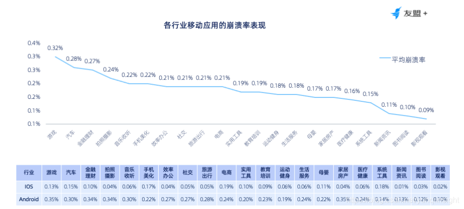 友盟+U-APM数据显示:APP 整体崩溃率为 0.29%,其中 Android 端崩溃率为0.32%, iOS 端崩溃率为0.10%。头部移动应用在崩溃表现方面表现更为优异,更加注重在应用质量治理方面的精细打磨。