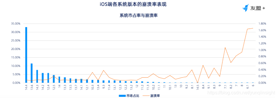 整体趋势上看,操作系统版本市场覆盖率越高,移动应用崩溃率越低。由于 iOS 端用户在操作系统版本升级方面的周期表现较为稳定,活跃版本较为集中,开发者随之也会对新版本给予相应的重视。