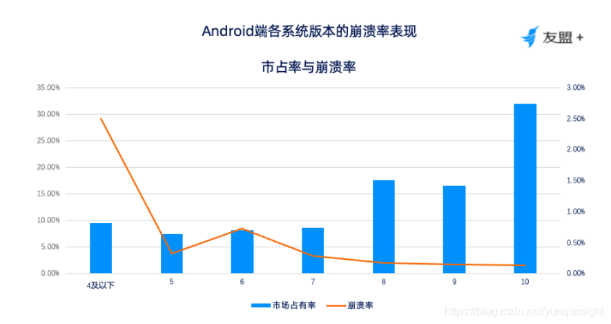 高版本崩溃表现显著优于整体均值:安卓版本的市场占有率以 Android10居首(32.03%), Android 8 (17.57%)略超出 Android9 (16.64%)这三个版本整体占据了2/3的 Android 市场,且崩溃率均在0.18%以下。