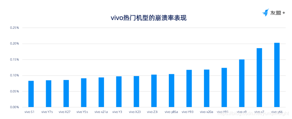 vivo 有三款热门机型的崩溃率超过了vivo 品牌整体平均崩溃率(0.15%),分别为 vivo Y66(0.20%)、vivo X7(0.19%)、vivo X9(0.15%)