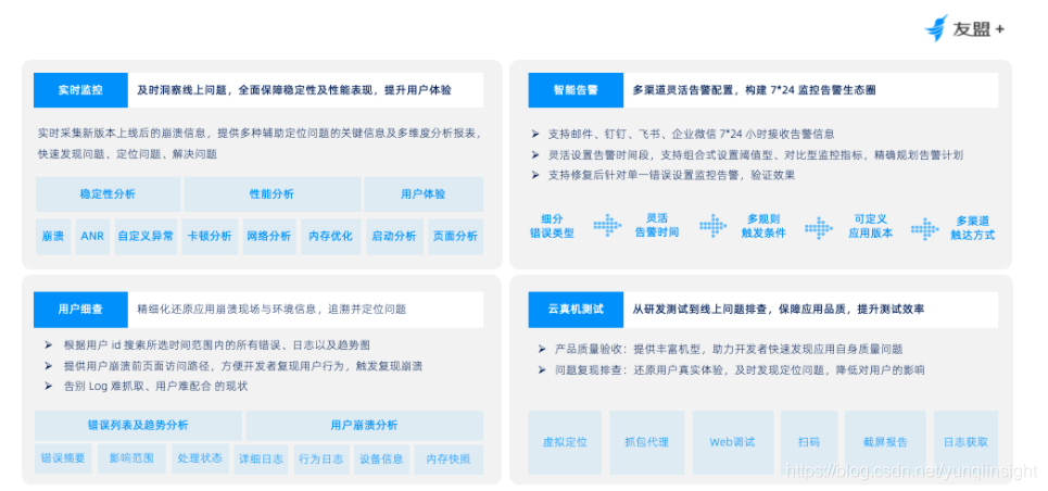 友盟+的U-APM应用性能监控平台基于强大的捕获采集能力,快速定位错误根源,提供用户维度的崩溃统计,快速还原崩溃现场,并设立多种警告通道,助力开发者7*24监控应用情况。