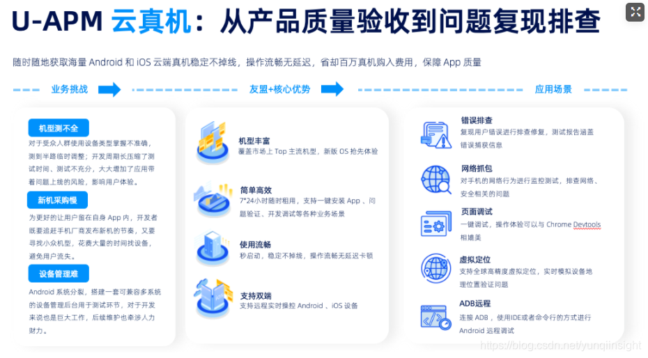 除此之外,友盟+提供云真机服务,通过海量Android、iOS真机,资源集中管理,合理调度分配,为开发者提供发版前测试、发现线上问题后复现等场景使用,助力开发者平衡成本与需求,提升研发效率。