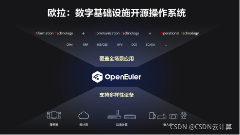 面对操作系统“软烟囱”带来的生态割裂、应用重复开发、协同繁琐的挑战,欧拉开源操作系统(openEuler)全新发布,定位为面向数字基础设施的开源操作系统,可广泛部署于服务器、云计算、边缘计算、嵌入式等各种形态设备,应用场景覆盖IT(Information Technology)、CT(Communication Technology)和OT(Operational Technology),欧拉创造性的提出全栈原子化解耦,支持版本灵活构建、服务自由组合,实现统一操作系统,支持多设备,应用一次开发,覆盖全场景。