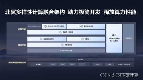 - 基础使能:提供通用、高效、高性能的开发基础工具,其中毕昇C++语言支持多样算力、可实现单一源码的跨算力统一编程;毕昇编译器支持多样算力统一编译和融合编译优化;北冥融合加速库拥有统一API接口、具备多算力协同能力。