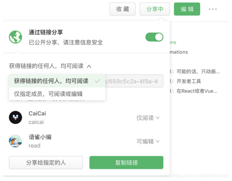 当文档编辑完成后,你可以通过在线的形式,或将文档导出为Word、PDF等本地文件来分享给朋友或者同事。如果希望非团队成员参与文档的编辑,可以使用文档的分享功能来解决。
