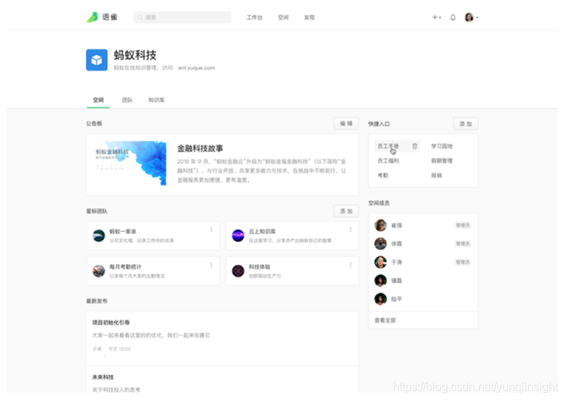 2019年4月22日,蚂蚁金服旗下知识创作与分享工具语雀发布“空间功能”。语雀在支持在线文档编写、多人协作、灵活的团队管理和金融级安全存储的基础上,新增“空间”功能,助力企业知识管理,帮助企业快速提升团队内容协作与知识管理效率,同时搭建企业知识门户,系统沉淀企业数据资产。